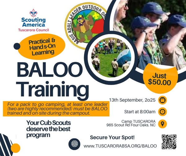 Time is running out, and so is space! Scout Leader training starts with BALOO! Cub Scout leaders need all the tools when they go camping. BALOO can help you! Be sure to share with your leaders. There are no limits to how many you can use! https://www.tuscarorabsa.org/balootraining #balootraining #trainingbsa #tuscaroracouncilbsa #camptuscarora #baloo #trainingbsa #camptuscarora (fb)