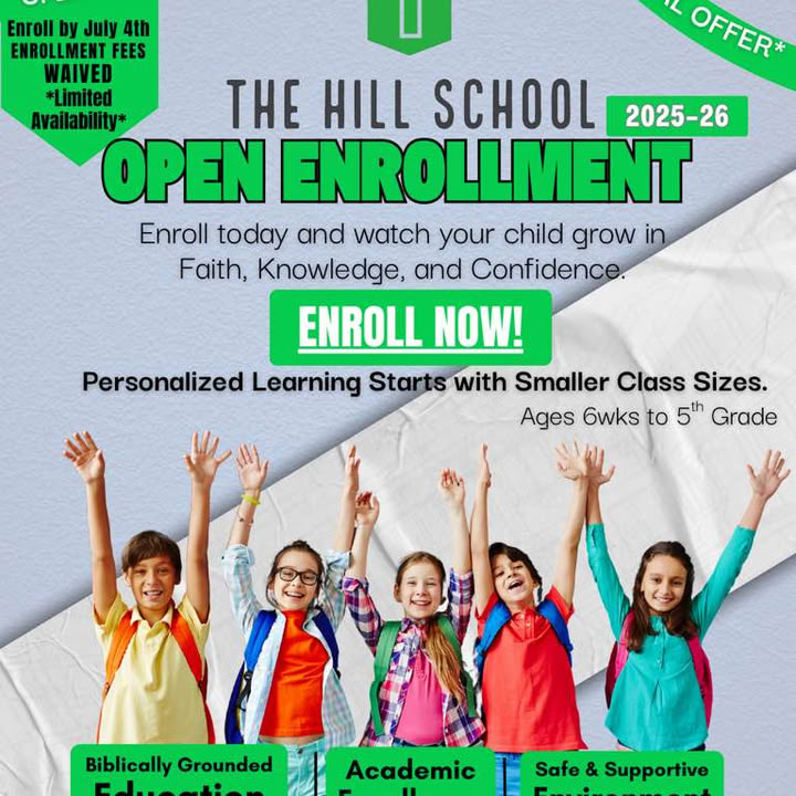 Open Enrollment for the 2025–26 School Year is NOW OPEN! Looking for a school that prioritizes faith, academics, and personalized attention? At The Hill School, we offer: • Small class sizes • Christ-centered curriculum • Academic excellence • A safe, supportive community Special offer: Enroll by July 4th and your enrollment fee is waived! Spots are limited—secure your child’s place today! Click here to enroll: (fb)