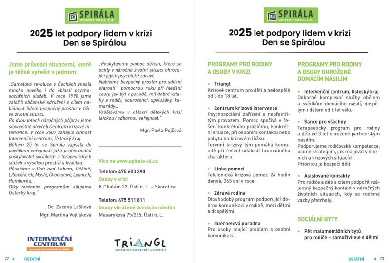 475 603 390 Nonstop linka pomoci 475 511 811 Domácí násilí SPIRÁLA, Ústecký kraj, z. s. Jsme nezisková organizace a od roku 2000 provázíme jednotlivce i rodiny krizí či náročnou životní situací – domácím násilím. Nabízíme nejen užitečné rady, ale především prostor i čas na sdílení toho, co se v životě daří i nedaří.