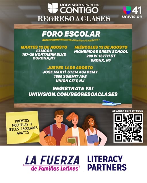 🎉 ¡Familias de Nueva York y New Jersey! ¡Prepárense para un nuevo ciclo escolar lleno de aprendizajes y alegría! La Fuerza de Familias Latinas de Literacy Partners se une nuevamente a Univision Contigo para celebrar el evento especial "Regreso a Clases", del 12 al 14 de agosto, en distintos puntos de NY y NJ. 📚🎒 Al asistir podrás recibir: ✔️ Mochilas GRATIS con útiles escolares ✔️ Libros para leer en casa con tus hijos ✔️ Recursos educativos y actividades para toda la familia ✔️ Información útil para apoyarte a ti también, porque tú eres el primer maestro de tus hijos 💡 ✨ Además, será una gran oportunidad para conectar con otras familias de tu comunidad. 🗓️ Regístrate antes del evento, el cupo es limitado: 🔗 Haz clic aquí para registrarte: https://bit.ly/RegresoClasesUnivisionFY26 📲 También puedes escanear el código QR en la imagen. 📢 ¡Ayúdanos a correr la voz! Comparte este evento con tus vecinos, familiares y amistades. ¡Te esperamos para comenzar el año escolar juntos y con mucha energía! #RegresoAClases #UnivisionContigo #LaFuerzaFamLatina #LiteracyPartners #FamiliasQueInspiran #ComunidadLatina -------------------------------------------------------------------------- We’re excited to once again join Univision Contigo for their annual “Regreso a Clases” events, happening August 12–14 in Queens, the Bronx, and Union City, NJ! Big thanks to Univision for inviting us to be part of this beautiful celebration of community, learning, and family. 🎒 Families can pick up free backpacks, school supplies, and books, and connect with organizations offering valuable resources to support the upcoming school year. 📚 We’ll be there with books and educational tools for parents and caregivers, and we’ll be happy to answer questions about our free English classes and community workshops. Register ahead of time here → https://bit.ly/RegresoClasesUnivisionFY26 ✨ Please share with your networks—let’s make sure every family is ready for back-to-school! #BackToSchool #FamilyPower #UnivisionContigo #LiteracyPartners #EarlyLiteracy #LaFuerzaFamLatina #ParentsAreTeachersToo #CommunityLove (fb)