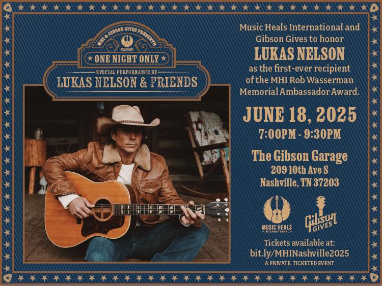 On Sale Now! Join Music Heals International and Gibson Gives at @officialgibsongarage in Nashville, TN, as we honor @lukasnelsonofficial — the first-ever recipient of the MHI Rob Wasserman Memorial Ambassador Award Lukas’s commitment to music and its healing power beautifully reflects the spirit of this award, and we’re thrilled to celebrate him at this special inaugural event This is a private, ticketed event — link in bio for tickets! http://bit.ly/MHINashville2025 #GibsonGuitar #GibsonGives @gibsonguitar (fb)