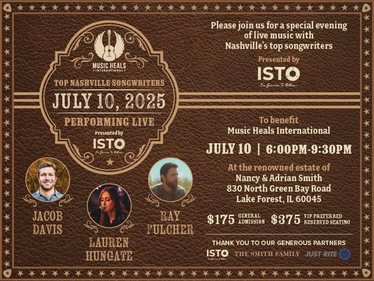We’re thrilled to officially announce our annual MHI Benefit in Lake Forest on July 10th Join us for an unforgettable night of music and purpose, featuring top songwriters @rayfulchermusic, @lauren_hungate, and @jacobdavismusic. Get your tickets now — https://mhinternational.giv.sh/b8c3 All proceeds support Music Heals International and our mission to bring music education to children globally (fb)
