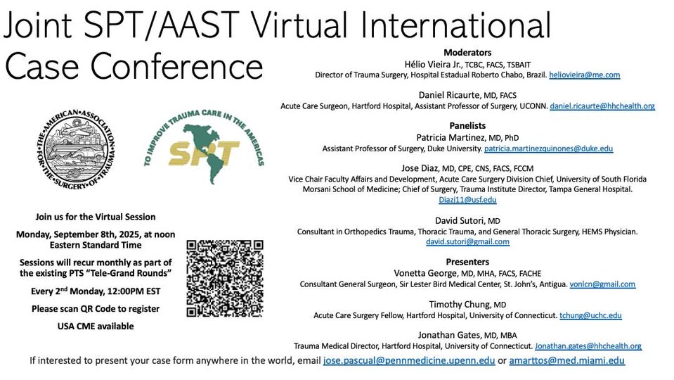 Today’s the day! Join us at 12 PM EST for the Joint Sociedad Panamericana de Trauma/Panamerican Trauma Society/AAST Virtual International Case Conference. 🌍 Connect with trauma & acute care experts worldwide 🩺 Learn from real cases & leaders in the field https://www.aast.org/spt-aast-virtual-international-case-conference (fb)