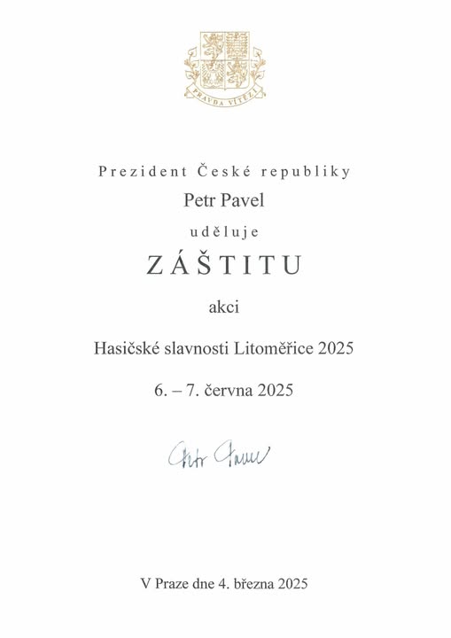 A je to tady! 🚒🔥 Záštitu nad 9. ročníkem Hasičských slavností Litoměřice 2025 potvrdil i prezident České republiky Petr Pavel🤝. Velmi si jeho rozhodnutí vážíme. ❤️ Záštitu vnímáme především jako výraz ocenění práce hasičů 🚒👨🚒, zároveň ale i úrovně samotných slavností 🎉, které Petr Pavel před lety, tehdy jako náčelník generálního štábu, již navštívil. ✨ Věříme, že si ve svém nabitém programu najde čas i tentokrát a hasičům přijede do Litoměřic podat ruku osobně. ✋😊 (fb)