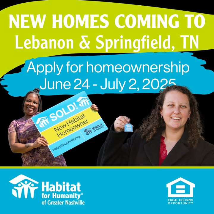 COMING SOON! New Homes. Big Possibilities. Looking to own a home in Wilson or Robertson County? We’re offering two affordable, quality homes—ideal for individuals and families ready to take the next step toward a brighter future! 📍 Lebanon & Springfield, TN 🛠️ 3 bed, 2 bath | Energy-efficient | Family-friendly communities 📅 Applications open June 24 – July 2, 2025 💻 Virtual Info Session: June 21 Learn more: habitatnashville.org/wilson-robertson-homeownership #HabitatForHumanity #HomeownershipOpportunity #WilsonCountyTN #RobertsonCountyTN #AffordableHomeownership #BuildWithHabitat (fb)