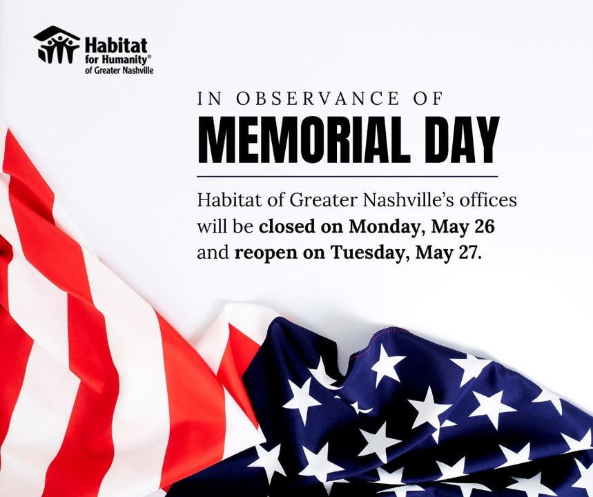 In Observance of Memorial Day Our Habitat offices will be closed on Monday, May 26 and reopen on Tuesday, May 27. (fb)