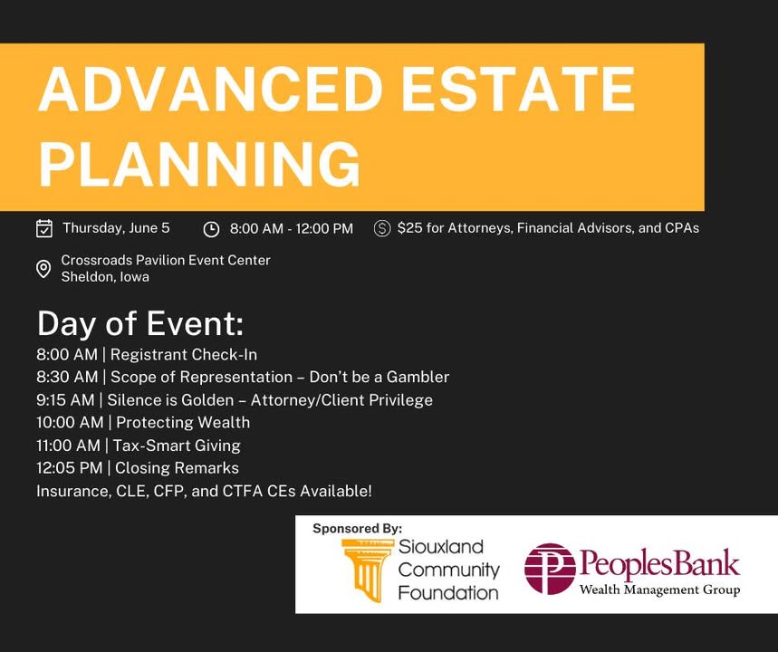 📢 Join Us for the Advanced Estate Planning Seminar! 📢 Attorneys, CPAs, FAs and Insurance professionals —don’t miss this opportunity to deepen your expertise! Our Advanced Estate Planning Seminar will cover critical topics, including: ✅ Ethical & legal responsibilities in estate representation ✅ Attorney-client privilege in estate administration ✅ Asset protection strategies to safeguard wealth ✅ Tax-smart charitable giving techniques 🗓 Date: Thursday, June 5, 2025 📍 Location: Crossroads Pavilion in Sheldon, IA ⏰ Time: 8:00 AM – Noon Gain insights from top experts Kyle Irvin and Mary Vandenack and elevate your estate planning strategies. Cost is only $25 and includes a continental breakfast. Register now! https://siouxlandcf.fcsuite.com/erp/donate/list/event?event_date_id=1693 CE credits offered for CLE, CTFA, CFP, and Insurance professionals! #EstatePlanning #WealthProtection #Philanthropy #TaxStrategies #LegalEthics (fb)
