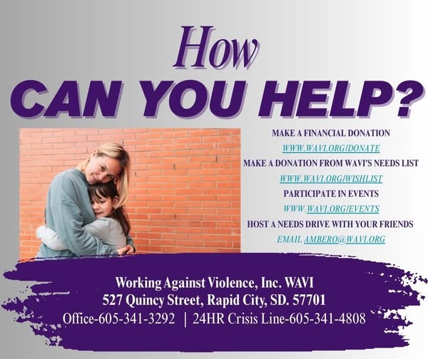 Help WAVI Continue Providing Safety, Support & Hope in the Black Hills. Every day, survivors of domestic violence, sexual assault, human trafficking, and intimate partner stalking turn to Working Against Violence, Inc. (WAVI) for emergency shelter, 24-hour crisis support, and compassionate advocacy. Your financial donation makes an immediate impact: • Provides safe shelter and warm meals for adults and children • Keeps our 24/7 crisis hotline open for those in urgent need • Funds counseling, legal advocacy, and support groups that help survivors rebuild their lives Together, we can create a community free of violence. Give today and help us continue to be a lifeline of hope. 👉 Donate securely at www.wavi.org/donate Thank you for standing with survivors and helping us make safety and healing possible (fb)