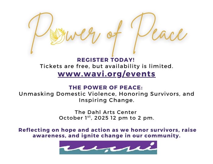 Have you registered for the Power of Peace event yet? Join WAVI on Wednesday, October 1st from 12–2 PM at The Dahl Arts Center as we kick off Domestic Violence Awareness Month with an inspiring celebration of unity and hope. Highlights include: • Community partner booths offering vital survivor resources • The official reading of the Executive Proclamation for National Domestic Violence Awareness Month • Keynote by Dr. Katie Edwards, national advocate and researcher on preventing sexual violence through community-led action • Honoring our 2025 Power of Peace Award Recipient, Beverly Lafferty 🎟️ Tickets are FREE but seats are limited! 👉 Reserve your spot today at www.wavi.org/events Let’s stand together for survivors and build a community free of violence. 🌟 (fb)