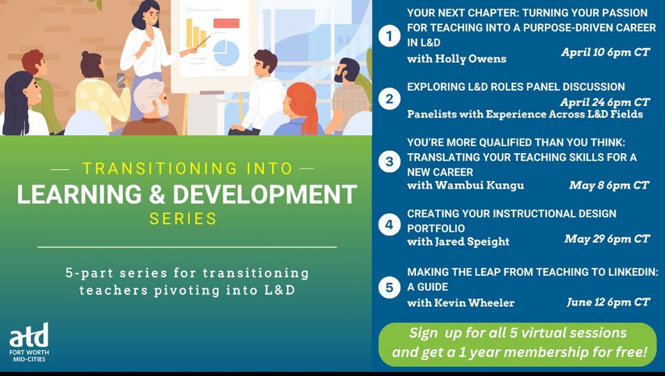 🚀 Calling all educators looking to transition into Talent Development! 🚀 Join #ATDFortWorth for Exploring L&D Roles: Career Transition SIG Part 2 of 5! 🗓️ Date: Thursday, April 24, 2025 ⏰ Time: 6:00 PM - 7:00 PM CT 📍 Location: Virtual attendance only 💰 Cost: FREE for Chapter Members | $10 for Guests 🔗 Register now: https://lnkd.in/gA3iQ9MA This is the second session in our exciting series designed to help educators like you explore the dynamic field of Learning & Development! 💡 In this engaging panel discussion, you'll hear from experienced L&D professionals from various industries and specialties, including: 🗣️ Kevin Kepple M.S. - Instructional Designer 🗣️ Alessandra LaTour, Ed.D. - Leadership Consultant 🗣️ Tana Taylor - Facilitator 🗣️ Lara Azcona - Change Management Moderated by: 🗣️ Timothy Koirtyohann - Recruiter Discover different L&D roles, see how your teaching skills translate, and learn about potential career pathways. Get real-world advice, expand your network, and bring your questions! 🤔 🎁 SPECIAL OFFER: Sign up for all 5 virtual sessions and receive a FREE 1-year #ATDFortWorth Chapter Membership! Don't miss out on this incredible opportunity to invest in your career transition. #ATDFortWorth #TransitioningTeachers #TalentDevelopment #LearningandDevelopment #CareerTransition #EducatorToLAndD #InstructionalDesign #LeadershipDevelopment #ChangeManagement #VirtualEvent #ProfessionalDevelopment #HR #Training #Networking (fb)