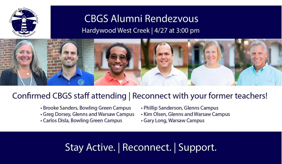 We are thrilled to announce the confirmed faculty attending our CBGS Alumni Rendezvous this coming Saturday, April 27th at 3:00 pm at Hardwood West Creek. We are excited to see everyone there! (fb)