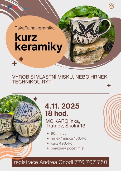 🎨 VYTVOŘTE SI SVŮJ JEDINEČNÝ HRNEK, nebo MISKU! ✨ Máte rádi originální kousky? Přijďte si k nám vyzkoušet kouzlo keramiky a techniky sgrafito (rytí do engoby)! Pod vedením lektorky Andrey TakaFajna keramika si vytvoříte vlastní, osobitý hrnek nebo misku. Budete rýt do vrstvy barevné hlíny (engoby), až dojde k odhalení původní barvy hlíny. Vznikne tak nádherný, kontrastní a zcela váš vlastní design! Žádné předchozí zkušenosti nepotřebujete, jen chuť tvořit. Odnesete si nejen skvělý zážitek, ale i funkční umělecké dílo. 🗓️ Kdy: 4.11.2025 ⏰ Čas: 18hod (90 minut) 📍 Kde: MC KAROlínka, Trutnov, Školní 13 💰 Cena: 150,-kč hrnek/ miska; 490,-kč kurzovné ➡️ Rezervujte si místo co nejdříve! Kapacita je omezená. Andrea Onodi 776 707 750 #Keramika #Sgrafito #KeramickýKurz #Tvorba #DIY #VlastníHrnek #Umění (fb)