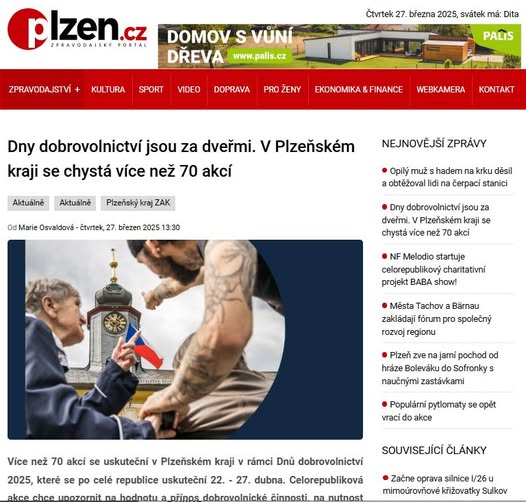 Více než 70 akcí se uskuteční v Plzeňském kraji v rámci Dnů dobrovolnictví 2025, které se po celé republice uskuteční 22. - 27. dubna. Celá nabídka DobroAkcí je ZDE: dnydobrovolnictvi.cz/program-2025/plzensky-kraj DOBROakce oslovují DOBROvolníky širokou nabídkou. Jde o akce venkovní i vnitřní, úklidové, pěstební, ty, které hledají pomoc pro organizaci výletů, pomoc pro hendikepované, další jsou určené těm, kteří umí šít, plést, háčkovat, nebo těm, kteří se nebojí fyzicky náročnějších prací. Více v článku 👉 plzen.cz/dny-dobrovolnictvi-jsou-za-dvermi-v-plzenskem-kraji-se-chysta-vice-nez-70-akci Dny dobrovolnictví Regionální dobrovolnické centrum Plzeňského kraje Národní asociace dobrovolnictví, z.s. Kooperativa - Čechy Západ ZAK TV EURONOVA GROUP ibis Plzen Obchodní centrum Plzeň Plaza (fb)
