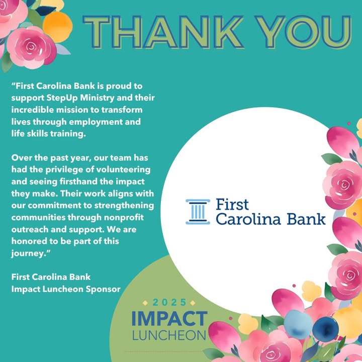 This is First Carolina Bank's first year being an Impact Luncheon sponsor, and we are so happy they chose to support our work! Thank you for believing in our mission and empowering our participants as they work to transform their lives! #support #sponsor #Impact2025 (fb)
