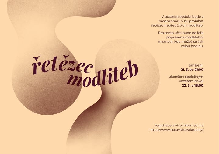 V postním období bude v našem sboru v Komorní Lhotce probíhat řetězec nepřetržitých modliteb v termínu od 21. 3. od 21 hodin do 22. 3. do 18 hodin, který bude zakončen společným večerem chval s doprovodnou skupinou.☺ Pro tento účel bude připravena modlitební místnost - klubovna vedle balkónu na faře. Rádi bychom Tě pozvali k přímluvným modlitbám za náš sbor.🙏🏼😌 Čas investovaný do modliteb je velmi důležitý, proto využij příležitost zapojit se do tohoto modlitebního zápasu. 🔥 Registrovat se můžete na https://www.sceavkl.cz/aktuality/retez-modliteb-21-3-2025 (fb)