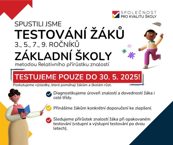🔓Zahájili jsme srovnávací testování žáků 3., 5., 7. a 9. tříd základních škol a odpovídajících tříd víceletých gymnázií metodou Relativního přírůstku znalostí! Testování i vyhodnocování výsledků probíhá elektronickou formou. Každá část testu obsahuje úvodní instrukci k vyplnění, cvičné úlohy a časový limit pro zpracování testu, přičemž zbývající čas do konce testu si žáci mohou kontrolovat na časomíře. 🎯Objednávat testování můžete zde: www.kvalitaskoly.cz/testovani Metodou relativního přírůstku znalostí se rozumí metoda pro zjišťování přidané hodnoty ve vzdělání žáka, která byla vyvinuta ve Společnosti pro kvalitu školy, z. s.. Tato metoda vychází z metodiky zjišťování přidané hodnoty v The Centre for Evaluation and Monitoring at University of Durham. ℹ️Pro získání relativního přírůstku znalostí žáka potřebujeme znát informaci, do jaké míry žák pracoval lépe či hůře, než by se dalo předpokládat. To, „co by se dalo předpokládat“, jsou výsledky shodné s výsledky podobných žáků na jiných školách. Žáci by si měli být podobní především tím, co se týká předchozích výsledků, protože právě ty jsou nejlepším předpokladem pro výsledky následující (Malčík, Krpec, 2010). ➡️Více informací: www.kvalitaskoly.cz/metoda-relativniho-prirustku-znalosti/ V rámci testování předáme 👐🏻 📑zprávu z testování pro žáka (ve formátu PDF) 📩zprávu z testování za školu (ve formátu PDF) 💻Ukázku demo testu naleznete na www.diagnostik.cz/demo. ❗Pokud s námi budete spolupracovat nebo jste s námi již testovali dva roky, nabídneme Vám kromě srovnání Vašich žáků, tříd a škol také zjištění přidané hodnoty vzdělání žáků na Vaší škole. Poskytujeme výsledky, které pomáhají žákům a školám růst. 📈 (fb)