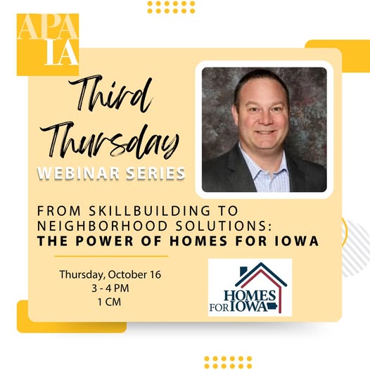 Join us for October’s Third Thursday Webinar! Discover how Homes for Iowa is addressing workforce housing needs while building valuable skills and stronger communities across the state. 📅 Thursday, October 16 🕒 3–4 PM | 1 CM 🎙️ Featuring Executive Director David Miller 🔗 Register now: https://iowa.planning.org/events/eventsingle/9317893/ #APAIowa #ThirdThursday #HomesForIowa (fb)