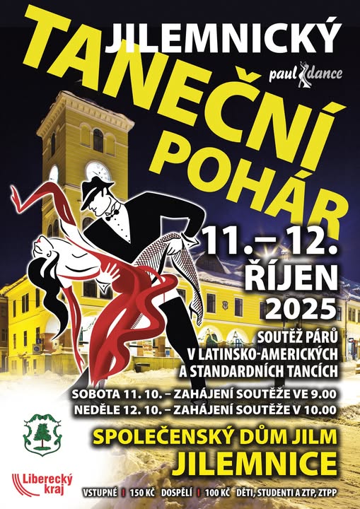 Zveme váš všechny na soutěž párů v latinsko-amerických a standardních tancích do Společenský Dům Jilm v sobotu 11. 10. 2025 a v neděli 12. 10. 2025. Tato akce je spolufinancovaná z Grantového programu Libereckého kraje (Liberecký kraj) a z Grantového programu Města Jilemnice (Město Jilemnice). (fb)