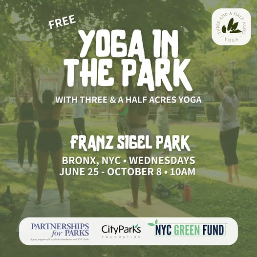 🌳 FREE YOGA IN THE BRONX! Join @threeandahalfacresyoga for Yoga in the Park every Wednesday at 10:00am at Franz Sigel Park from June 25 to October 1! Move, breathe, and build community under the trees. All levels welcome! Please bring a yoga mat or towel and water! 📍 Franz Sigel Park, Bronx, NYC 🗓 Wednesdays 10:00am 💚 FREE & open to the public 📝 While this event is free, registration is encouraged! Link in bio to sign up! Brought to you with support from @cpfnyc #nycgreenfund #partnershipsforparks #YogaInThePark #BronxYoga #FreeYoga #WellnessForAll #threeandahalfacresyoga (fb)