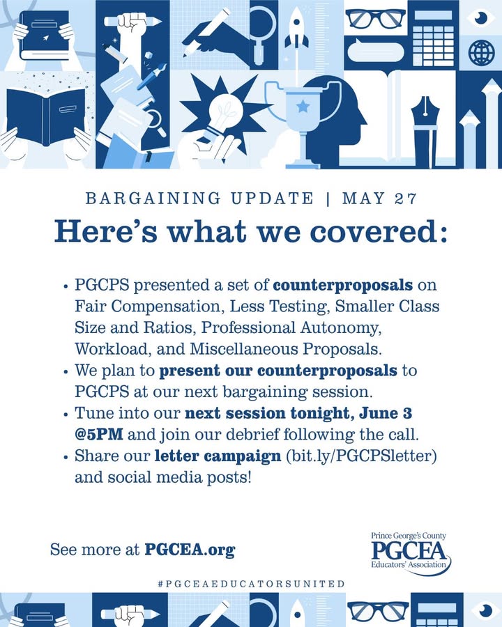 View the full 5/27 bargaining summary on https://pgcea.org/may-27-2025-bargaining-update/ and join #PGCEAEducatorsUnited in #RedforEd TONIGHT, June 3 @5PM! Bargaining Session: https://pgcps-org.zoom.us/j/87381576688#success Debrief: https://us06web.zoom.us/j/89086651158?pwd=NRCQB2zBVvZtZPWQVdXzEFIKFtdmOL.1 (fb)