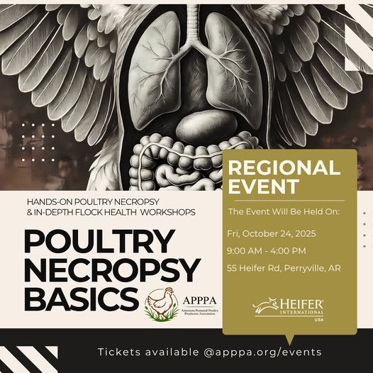 If you’ve been raising chickens long enough, eventually one will perish unexpectedly and you’re often left wondering, “Why?” When done properly, necropsy can be a powerful post mortem tool to understanding flock health. Join the APPPA team at Heifer Ranch for the final 2025 Regional Event and learn how to confidently perform “avian autopsy” during our hands-on small group demonstrations. We’ll also have an extended farm tour of their working Savory Hub, see autonomous RovaBarns in action, and have a farm fresh lunch. Bonus: Stay on the ranch with their convenient on farm lodging options, too! (fb)