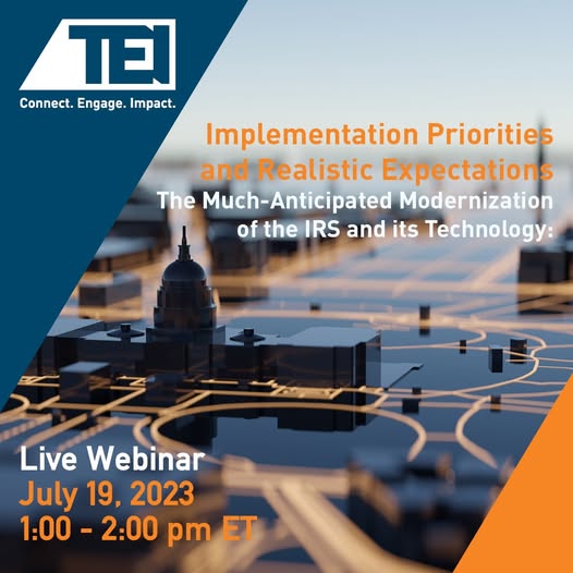 Live Webinar! On July 19, join TEI and the IRS for The Much-Anticipated Modernization of the IRS and its Technology: Implementation Priorities and Realistic Expectations. Secure your seat now to hear, first-hand how the IRS intends to move forward in this uncertain environment and provide comments that will help shape how the IRS uses technology to transform the agency. #tei #tax #irs (fb)