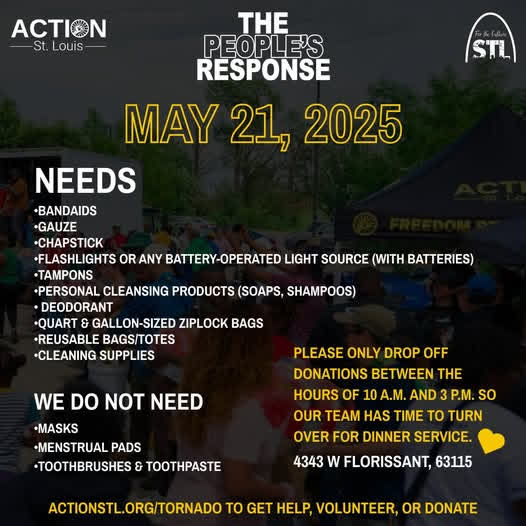 📢 Looking to help our St. Louis neighbors impacted by the recent tornadoes? Action St. Louis is accepting donations today only (May 21) to support local families through The People's Response. 🕙 Drop-off window: 10 AM – 3 PM 📍 Location: 4343 W Florissant, St. Louis, MO 63115 ✅ Items needed: • Band-aids • Gauze • Chapstick • Flashlights (with batteries) • Tampons • Personal cleansing products • Deodorant • Quart & gallon ziplock bags • Reusable bags • Cleaning supplies 🚫 Not needed today: masks, menstrual pads, toothbrushes, or toothpaste. Please share this post to spread the word — every bit helps. 💛 Learn more: https://bit.ly/44IJTPq #STLStrong #TornadoRelief #ThePeoplesResponse #YMCA #CommunitySupport (fb)
