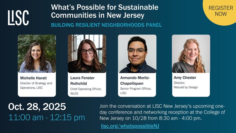 🌱 Happening NOW at LISC New Jersey! 🌱 Our Chief Operating Officer Laura Fenster Rothchild is joining an incredible panel discussion on "What's Possible for Sustainable Communities in New Jersey." 📍 College of New Jersey 🕐 Building Resilient Neighborhoods Panel: 11:00 AM - 12:15 PM Laura will be sharing insights alongside leaders from LISC and Rebuild by Design on how we can create more sustainable, resilient communities across New Jersey. Follow along as we discuss the future of community development in our state! 💚 #SustainableCommunities #NewJersey #CommunityDevelopment #ResilientNeighborhoods #ISLES #LISC (fb)