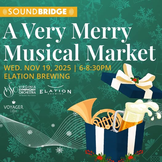Your Favorite Musical Market is BACK! Join us November 19th at Elation Brewing for A Very Merry Musical Market and get your holiday shopping done early with amazing local vendors 🎁as you sip on tasty brews🍻 and enjoy the sounds🎶 of the season from the amazing VSO Brass section🎺! This event will sell out so make sure to get your tickets before its too late. Tickets $20 in advance. $25 at the door. Children 12 and under, $12. Your ticket includes light snacks and one drink ticket (non-alcoholic and kid-friendly options will be available). Additional beverages and food available for purchase. https://virginiasymphony.org/event/a-very-merry-musical-market-2/ Elation Brewing (fb)