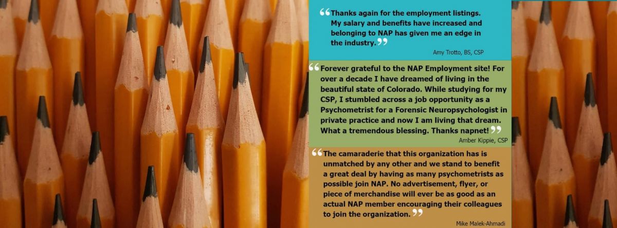 2025 NAP Professional Practices and Salary Survey WELCOME The National Association of Psychometrists NAP is a nonprofit professional organization dedicated to achieving excellence in psychometry. Our charter is to establish a communications network provide venues for professional networking and promote the psychometry profession as a whole. Membership is open to psychology students and professional psychometrists. JOIN NOW MEMBERS POTENTIAL MEMBERS Join and login to access the discussion board job opportunities member directory and other professional resources.