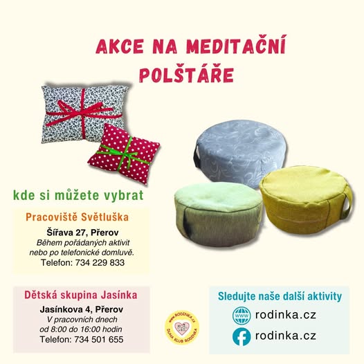 ⏳Ještě si můžete pořídit ten svůj ⏳ 🧘♀️ Víte, že způsob, jakým sedíme, ovlivňuje nejen naši páteř, ale i naši mysl? Správné držení těla při relaxaci nebo meditaci pomáhá snížit stres, podpořit soustředění a uvolnit napětí v těle. A právě meditační polštář je skvělým pomocníkem, který vám v tom pomůže! 💚 Proč si ho pořídit právě teď? ✅ Poskytuje správnou oporu pro zdravé sezení. ✅ Pomáhá prohloubit dech a zlepšit koncentraci. ✅ Navíc podpoříte naši chráněnou dílnu a dáte práci lidem, kteří ji potřebují. 🛍Naše akční cena, ke dni učitelů do 31. 3.! 💙 Velký polštář – nyní jen 500 Kč (původně 600 Kč) 💛 Menší polštář – nyní jen 400 Kč (původně 480 Kč) 📢 Nečekejte! Akce platí už jen pár dní! 📢 📩 Objednávejte v zprávách nebo osobně na Rodince v Přerově! 💬 Jaké jsou vaše oblíbené způsoby relaxace? Podělte se s námi v komentářích! ⬇️😊 (fb)