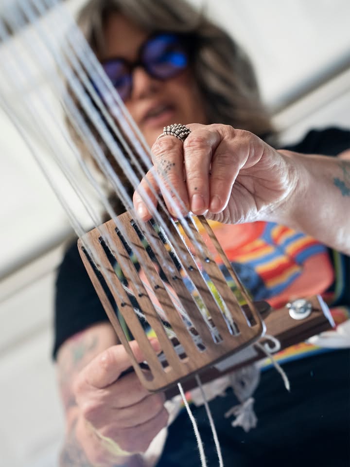 KCAI Fiber Lecturer Rebecca Vaughan is preparing for a summer AdultLab course (open to the public!) called "Portable Looms and Weaving." Registration Link: http://www.kcai.edu/portableloomsandweaving In this class, she’ll introduce students to several different weaving methods that can be used around the house or taken on the go — very flexible. Rebecca’s personal artwork is closely tied to her story: "I'm adopted and have spent my life searching for my biological family. The inkle loom requires anchoring to something solid to work. That symbolism resonates with me deeply — it’s like attaching yourself to a place, even temporarily, to create something." Last year, she co-curated an exhibition in Northern Ireland and needed a loom she could travel with, since there were shows in both Derry and Belfast. "So, I made 14 of these looms by hand. I cut the rigid heddles, the shuttles, and the beaters. I used Missouri walnut for the frame and sourced Kansas wool. Then, once I got to Ireland, I got Irish wool so that the warp was from Missouri and the weft from Ireland. It became a kind of conceptual weaving — connecting materials from different parts of my life." Rebecca is designing the course to be approachable and fun. These AdultLab classes are open to the public and aim to spark the joy of making. After 25 years of teaching at the college level, she knows there’s no one-size-fits-all method of learning. She builds her classes to support many styles, using demos, visuals, and hands-on instruction. "I hope they leave with a love for making," she says. "They’ll walk away with their own loom, knowledge of how to warp and weave, and an understanding of different shapes and textures. More than anything, I hope they feel empowered to keep experimenting and maybe even teach someone else or take another class." "If they keep weaving," she adds, "they’ll keep learning." Registration is required. Learn more here: http://www.kcai.edu/portableloomsandweaving #kcai #kansascityartinstitute #fiberarts #weavingclass #textileart #artanddesign #adultartclass #creativekc #summerworkshops #handmadeloom #portablelooms #arteducation (fb)