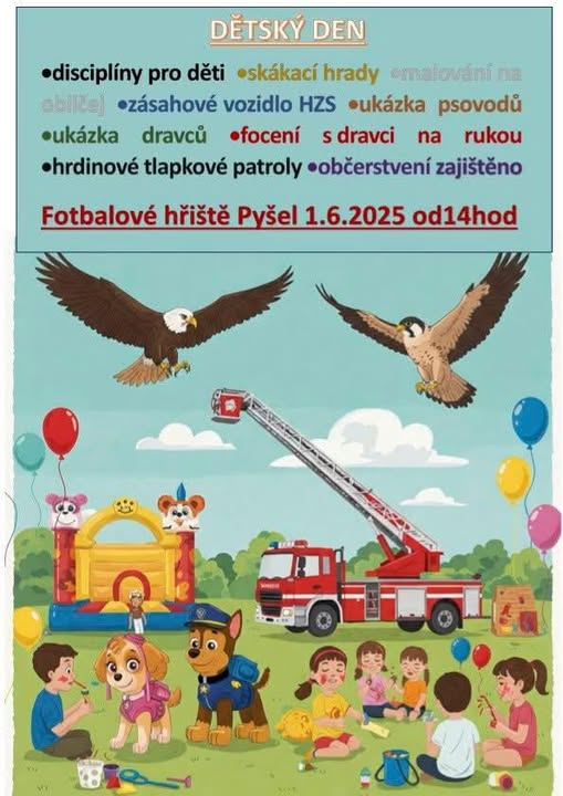 Sokol Pyšel Vás, především děti zve na dětský den, který se bude konat na mezinárodní den dětí, a to dne 1. 6. 2025 od 14hod. ve sportovním areálu Pyšel. 🤩🤩 Těšíme se a Vy se taky těšte!🐕🦅🐾 (fb)