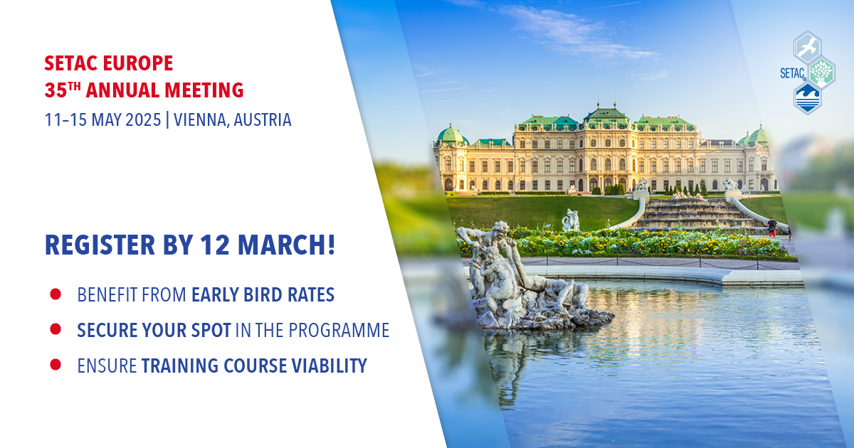#SETACVienna's early bird registration deadline is fast approaching!⏳ Register by 12 March to secure early bird rates and ensure your place in the programme of the SETAC Europe 35th Annual Meeting in Vienna! 🎓 Thinking about joining a training course? Our diverse lineup of Sunday courses gives you the chance to deepen your expertise and gain hands-on skills. But hurry up! Courses can only run with enough participants—so sign up before 12 March to make sure they happen! 👉🏼 Register https://www.setac.org/discover-events/global-meetings/setac-europe-35th-annual-meeting/registration/registration.html 👀 View courses https://www.setac.org/discover-events/global-meetings/setac-europe-35th-annual-meeting/programme/training-courses.html (fb)