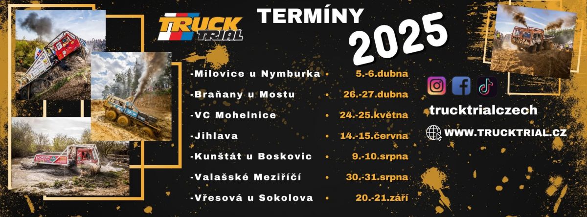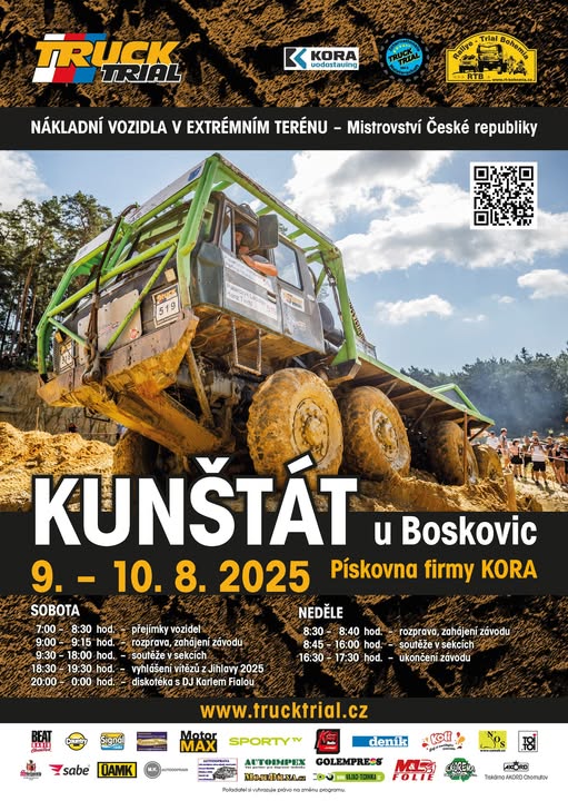 TRUCK TRIAL / Prosíme o SDÍLENÍ Datum: 9 a 10. srpna 2025 Místo: KUNŠTÁT / okres BLANSKO Název: 27. MISTROVSTVÍ ČESKÉ REPUBLIKY V JÍZDĚ EXTREMNÍM TERÉNEM 2025 - 5. soutěžní víkend sezony Program- pořadatel si vyhrazuje právo na změnu programu. SOBOTA 9:00 – 9:15 Rozprava a zahájení závodu 9:30 – 18:00 Soutěže v sekcích 18:30 – 19:30 Vyhlášení výsledků za předchozí závod 20:00 – 00:00 Diskotéka s Karlem Fialou (regionální moderátor a dj) NEDĚLE 8:30 – 8:45 Rozprava a zahájení závodu 8:45 – 16:00 Soutěže v sekcích Informace o vstupném: https://trucktrial.cz/vstupne/ www.trucktrial.cz 27. sezóna otevřeného Mistrovství ČR v Truck trialu je za polovinou všech soutěžních víkendů. V roce 2025 se fanoušci tohoto adrenalinového klání řidičů upravených nákladních vozů mohou těšit do oblíbených lokalit. První soutěžní víkend sezóny proběhl v Milovicích, v Braňanech u Mostu, Mohelnici a v Jihlavě, následuje v Kunštátu na Blanensku, Hrachovci u Valašského Meziříčí a opět Milovice. Těšit se můžete na ukázky dovednosti řidičů nákladních vozidel, jezdících v terénu a rozdělených do několika kategorií. V závodech uvidíte speciálně upravené vozy různých značek. Závodníci mají vždy za úkol projet vyznačenou sekci bez dotyku označených branek a navíc v daném časovém rozhraní. Často jsou závodní vozy opravdu na hraně a ne zřídka dochází k jejich převrácení. To je také jedním z důvodů proč být u toho, byť jako divák. Na startu nové sezóny diváci uvidí nejenom stálé “trialisty”, ale i všechny loňské mistry ČR a mnoho nováčků, kteří si stihli koupit již hotové auto, a nebo si postavili nové. Veškeré termíny soutěžních víkendů, novinky, loňské výsledky a fotogalerie najdete na stránkách www.trucktrial.cz. Následující termíny soutěže: 09.08. - 10.08.2025 / Kunštát na Blanensku 30.08. - 31.08.2025. / Valašské Meziříčí (Hrachovec) 20.09. - 21.09.2025. / Milovice Co je Truck trial. ……….. Je to sport, který je o jezdeckém umění, o tom jak překonat zdánlivě nepřekonatelné. Na všech závodech se projíždí abnormálně těžký terén, někdy i uměle vytvořený. Není to o tom pouze zdolat prudký svah, je to o tom se v tomto terénu orientovat a projet stanovenou sekci a umístěné branky i za cenu, že nevíte, zda zákony o zemské přitažlivosti budou platit, nebo jej posunete o něco dál. Pokud to nevyjde, poperete se s těmito zákony příště znovu. Otázku, zda se v sekci, kde je plno bahna i vody „utopíte“, nebo úspěšně projedete, si většinou závodníci pokládají až po “závodě”. Pro toho, kdo projede, je to otázka zcela jasná, pro toho, kdo neprojede, je to výzva, jak takové náročné úseky pokořit příště. Další záludný terén může být i písek, nebo kamenitá stráň. Protože hranice, o které si člověk myslí, že je nepřekonatelná, je ve skutečnosti mnohem, mnohem dál. Nic pro slabé nátury. Je to sport pro opravdu silné jedince. Soutěž probíhá v 7. kategoriích. S1 - MB Unimog, Tatra 805 S2 - MB Unimog, IFA W50, Avia, Praga, Viza ROSS S3 - Tatra 138, Praga V3S, Liaz, Viza ROSS S4 - Tatra 813 a 815 6x6, Ural S5 - Tatra 813 8x8 P1 a P2 kategorie malých a velkých unikátních prototypů, kdy každý z vozů je originál. (fb)