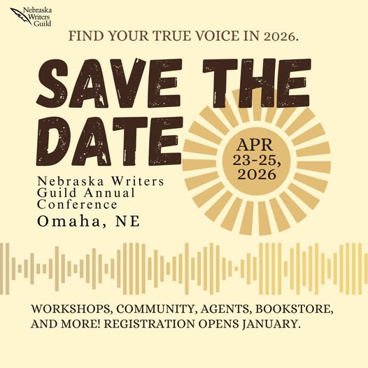 Save the Date! Find your True Voice in 2026! Nebraska Writers Guild Annual Conference April 23–25, 2026, Omaha, Nebraska 👉 Keynote: Peter Rubie, FinePrint Literary Management 👉 Workshops, community, agents, bookstore, and more! 👉 Call for pitches open NOW! Registration opens January. (fb)