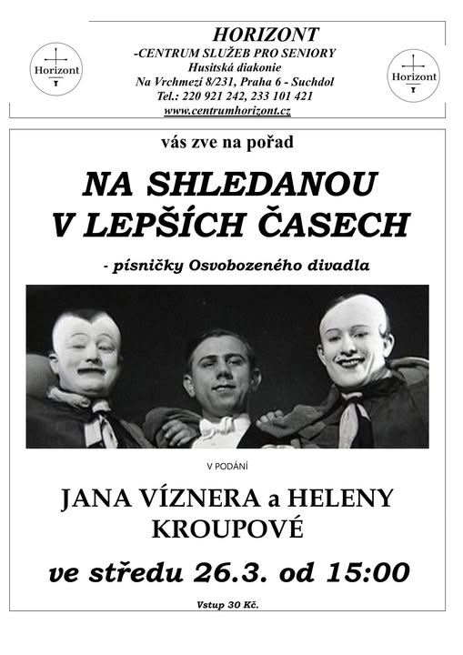 Ve středu 26.3. Vás zveme na koncert Na shledanou v lepších časech - písničky Osvobozeného divadla v podání Jana Víznera a Heleny Kroupové 🎷🎶🎹 (fb)