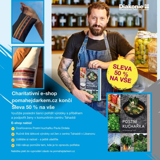 🎁 VÝPRODEJ – SLEVA 50 % NA VŠE! 🎁Veškeré zboží na našem charitativním e-shopu pomahejdarkem.cz nyní pořídíte za polovinu ceny! 🧵 Nakupte jedinečné, ručně šité výrobky z šicí dílny, která dává práci a naději ženám z komunitního centra Tahaddi. Díky vaší podpoře mohou lépe zabezpečit své rodiny. 🍽️ V nabídce je též Postní kuchařka od šéfkuchaře Pavel Drdel z oceňované restaurace Sůl & Řepa. Více než 80 receptů na moderní chutná bezmasá hlavní jídla, polévky a saláty a 60 návodů jak uchovat sezónní zeleninu díky fermentaci, nakládání či sušení. Loučíme se s e-shopem, proto nabídka platí do 20. 9. nebo vyprodání zásob. Neváhejte další taková nabídka nebude. Rychle na pomahejdarkem.cz 🎁 Nakupte výhodně a pomozte tam, kde je to opravdu potřeba. Děkujeme. #Diakonie #DiakonieSvet #Pomahejdarkem #PomahatJeNormalni #Dárek #PostniKucharka #PavelDrdel #SulARepa #Fermentace #Vyprodej #Sleva (fb)