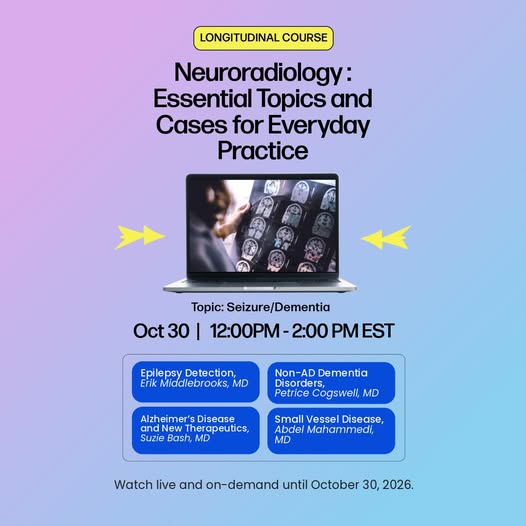 Tomorrow! Join us for expert insights into seizure and dementia imaging—from epilepsy detection to small vessel disease. Register now: https://www.arrs.org/ARRSLIVE/Education/Meetings/Symposia/LC25_Neuro.aspx (fb)