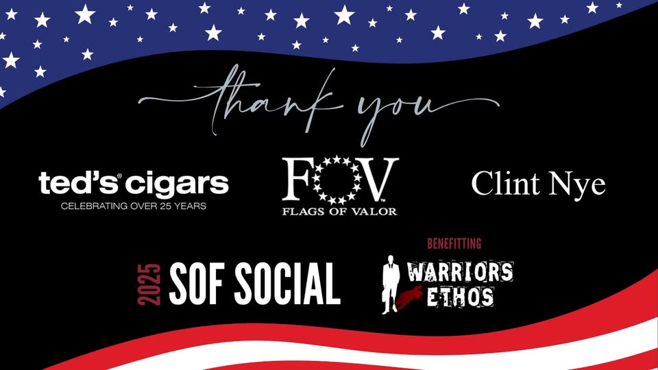 Warriors Ethos would like to recognize Ted's Cigars, Flags of Valor, and Clint Nye for their generous donations to the silent auction at the 2025 SOF Social. Your generosity helped make our event successful and allows us to continue our mission of assisting transitioning service members and their families. Thank you again! #WarriorsEthos #SOFSocial #VeteransInTransition #SupportingVeterans #SilentAuctionDonations #GivingBack #Fundraiser #TedsCigars #FlagsOfValor #ClintNye (fb)