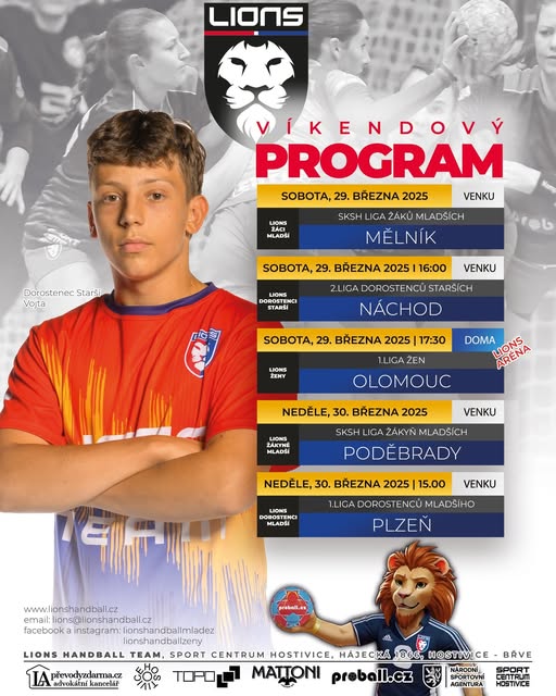 NEJBLIZSI DOMACI UTKANI V LIONS ARENE SPORT CENTRA HOSTIVICE DOMACI UTKANI ZEN LIONS TEAM JINDRICHUV HRADEC DOMACI UTKANI DOROSTU MLD LIONS TEAM HC ZUBRI DOMACI UTKANI DOROSTU STR LIONS TEAM LOKO VRSOVICE LIONS Handball Team LIONStym zenhraje od sezony 20202021 1. ligu hazene zen nejvyssi republikovou soutez. LIONS tym dorostu mladsihovstoupil do nejvyssi souteze do 1. ligy hazene dorostu mladsiho v sezone 20242025.
