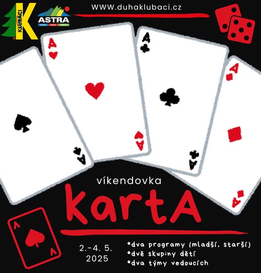 🔥 Víkendovka Karta – Dva programy, jedno dobrodružství! 🔥 Jedinečný víkend pro mladší i starší! Každá skupina si užije svůj vlastní program, ale občas se jejich světy propojí. Pojď si užít poslední víkendovku v tomto školním roce! 🌟 📅 2.–4. května 2025 📌 Přihlaste se hned! Potřebujeme znát váš zájem, aby to bylo nejvíc nejlepší. (fb)