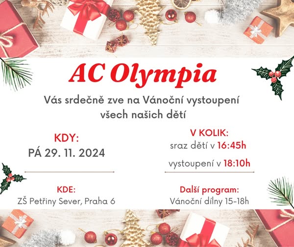 🎄🌟 Srdečně vás zveme na Vánoční vystoupení AC Olympia! 🌟 Milí rodiče, prarodiče, kamarádi a všichni příznivci dětského aerobiku, přijďte si užít kouzelnou atmosféru naší Vánoční show, kterou pro vás připravil aerobický klub AC Olympia! ✨ 🗓 Kdy: Pátek 29. 11. 2024 ⏰ Čas: 18:10 📍 Kde: Velká tělocvična ZŠ Petřiny Sever Vystoupení proběhne v rámci Vánočních dílen a naše děvčata se už moc těší, až vám ukážou, co všechno nacvičila! 💪🎶 Důležité informace: Děti mají sraz v 16:45 před malou tělocvičnou – prosíme, ať jsou již převlečené a učesané podle pokynů, které jste obdrželi e-mailem. Rodiče a hosty prosíme, aby se před vstupem do velké tělocvičny zuli. Těšíme se na vás, přijďte podpořit naše holky a načerpat vánoční náladu! 🎅🎄 Tým AC Olympia (fb)