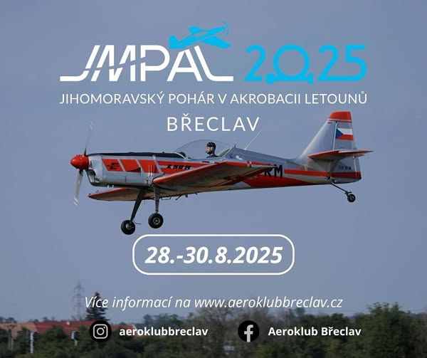Již 3. ročník Jihomoravského poháru v akrobacii letounů se bude konat od 28. do 30.8. na letišti v Břeclavi za podpory Jihomoravského kraje a Města Břeclav✈️ Před závody budou probíhat tréninky, které budou veřejně přístupné✅ Rovněž bude možné se dojít podívat na závody samotné, do divácké zóny, která pro Vás bude na letišti připravena🤩 (fb)