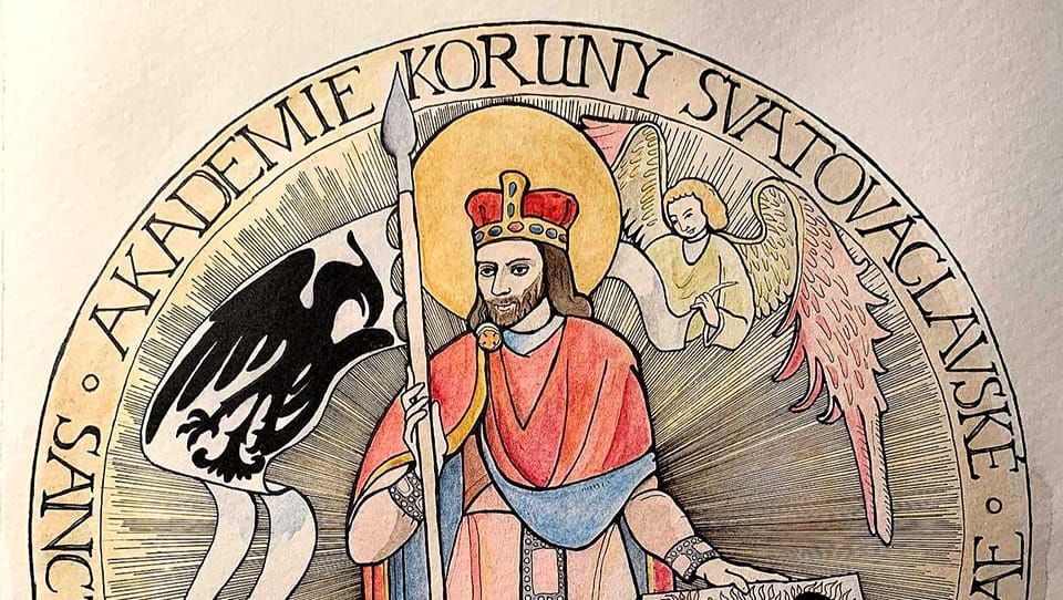 Akademie Koruny svatovaclavske Nazev akademie byl venovan svatemu Vaclavovi premyslovskemu knizeti a patronu Cech a Moravy a jednomu ztradicnich symbolu ceskeho statu. Akademie venovanim nazvu patronu Cech a Moravy vzdava poctu predkum a hlasi se kjejich odkazum Velkomoravske risi prvnimu stabilnimu knizectvi zapadnich Slovanu ve stredni Evrope Korune kralovstvi ceskeho statnimu utvaru ktery byl tvoren svazkem zemi pod svrchovanosti ceskeho krale a jehoz jadro tvorily korunni ceske zeme tj. Ceske kralovstvi Moravske markrabstvi Opavske knizectvi a jednotliva slezska knizectvi. Zpravy 5.