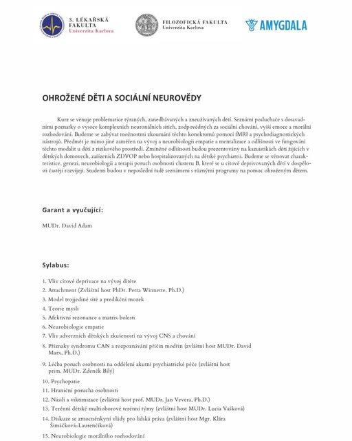 Zajímá Vás problematika týraných, zanedbávaných a zneužívaných dětí? Chcete se seznámit s dosavadními poznatky o vysoce komplexních neuronálních sítích zodpovědných za sociální chování, vyšší emoce a morální rozhodování? Chtěli byste se více dozvědět a psychoterapii a léčbě vývojových traumat? Zajímavá vás systém sociálně-právní ochrany dětí? Pak je kurz Ohrožené děti a sociální neurovědy právě pro Vás. Přihlašování na 3. lékařská fakulta Univerzity Karlovy je již v plném proudu. Přihlašování pro studenty ostatních fakult Univerzity Karlovy bude otevřeno 23.9. (fb)