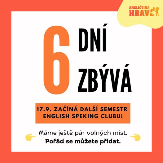 🎉 17.9. Startujeme. 🎉 Opět se pouštíme za dobrodružstvím a spoustou zábavy – a jen tak mimochodem zlepšíme dětem schopnost komunikovat v angličtině. 🇬🇧 💬 Tentokrát spouštíme 3 skupiny. 👶🏻 Benjamínci 6 – 8 (Úterky od 16:00) 🤸 Školáci: 9 – 11 (Úterky od 16:50) 🧑🏻🎓 Teenageři: 12 – 15 (Úterky od 18:00) ➡Pořád máme volná místa a můžeme vaše děti přivítat mezi námi. Registrovat se můžete na: www.anglictinahrave.cz ⬅️ (fb)