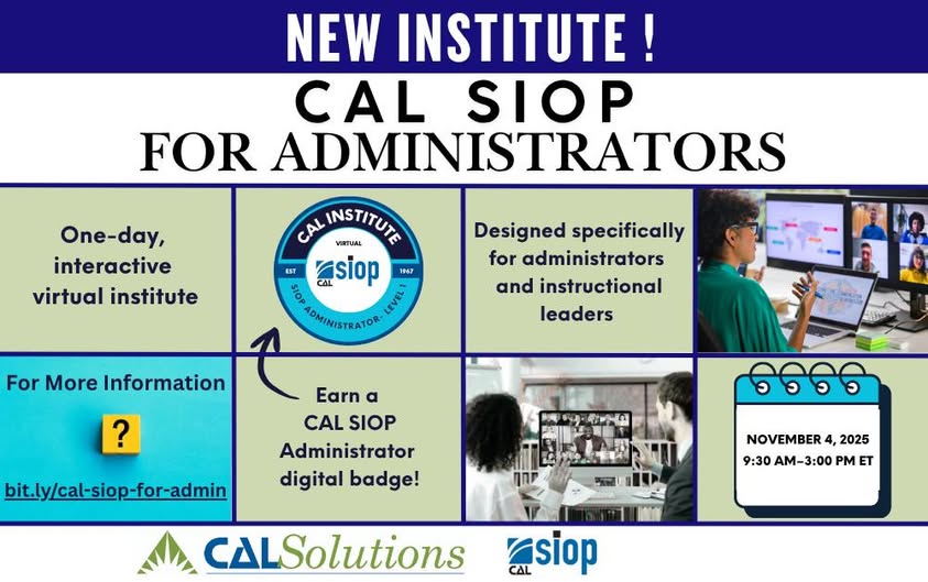 📢 For the first time ever, CAL is offering a SIOP for Administrators Institute — designed just for school and district leaders! On November 4, 2025, join this interactive virtual institute to: ✔️ Understand how the SIOP Model supports multilingual learners ✔️ Learn how to recognize high-quality sheltered instruction in classrooms ✔️ Build systems of support for teachers ✔️ Sustain SIOP implementation across your school or district 🗓 Date: November 4, 2025 | 9:30 AM – 3:00 PM ET 💻 Delivered virtually via Zoom 💲 Early bird rate extended through 10/24 📅 Registration closes October 27 Participants will also earn a CAL SIOP digital badge to share on LinkedIn and other professional platforms. 👉 Reserve your spot: https://bit.ly/cal-siop-for-admin #SchoolLeaders #SIOP #MultilingualLearners #CALPD (fb)