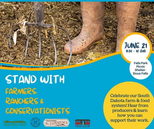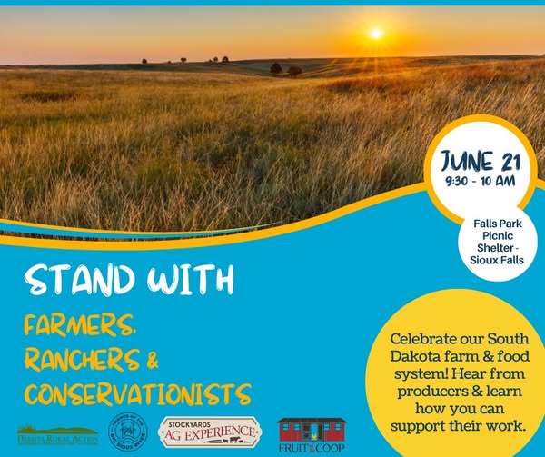 Let's stand up for our food & farm system! Join us at 9:30 AM on Saturday, June 21, at Falls Park in Sioux Falls as we stand with farmers, ranchers, and conservationists. 🌾 We are at a point of great uncertainty and chaos in our food and farm system. From trade wars to funding freezes and a farm bill that is already 2 years overdue, our producers deserve better! Our farmers, ranchers, and conservationists in South Dakota are doing important, essential work and should be able to trust their contracts, program supports, and technical assistance to plan for their operations. Come hear from South Dakota producers who work every day to produce the food and crops we rely on, and learn how we, as neighbors, eaters, and citizens, can support this vital work. Learn more at bit.ly/standfarmers! (fb)