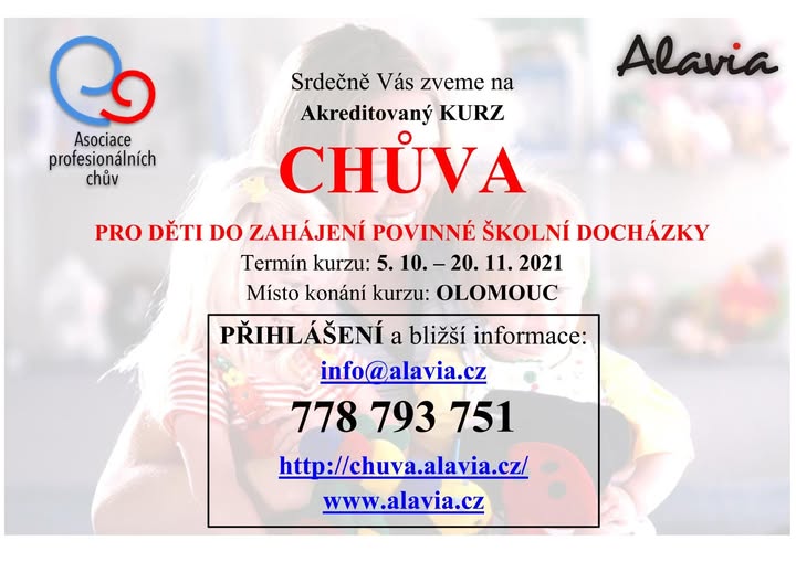 Vitejte v Asociaci profesionalnich chuv Asociace ktera haji prava a reprezentuje postoje profesionalnich chuv Akreditovane kurzy Chuva pro deti do zahajeni povinne skolni dochazky Olomouc Akreditovany kurz 5. rijna 21. listopadu 2020 Zkouska 21. listopadu 2020 O nas Asociace profesionalnich chuv vznikla z potreby poskytnout pravni odbornou a metodickou podporu stale se zvetsujici clenske zakladne chuv ktere pusobi jak v zarizenich pece o deti tak v rodinach.